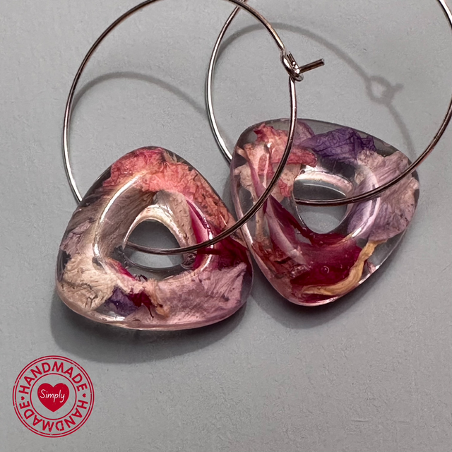Perfect for Spring and Summer, these triangular doughnut charms filled with dried real flower petals on silver stainless steel 3cm hoops.